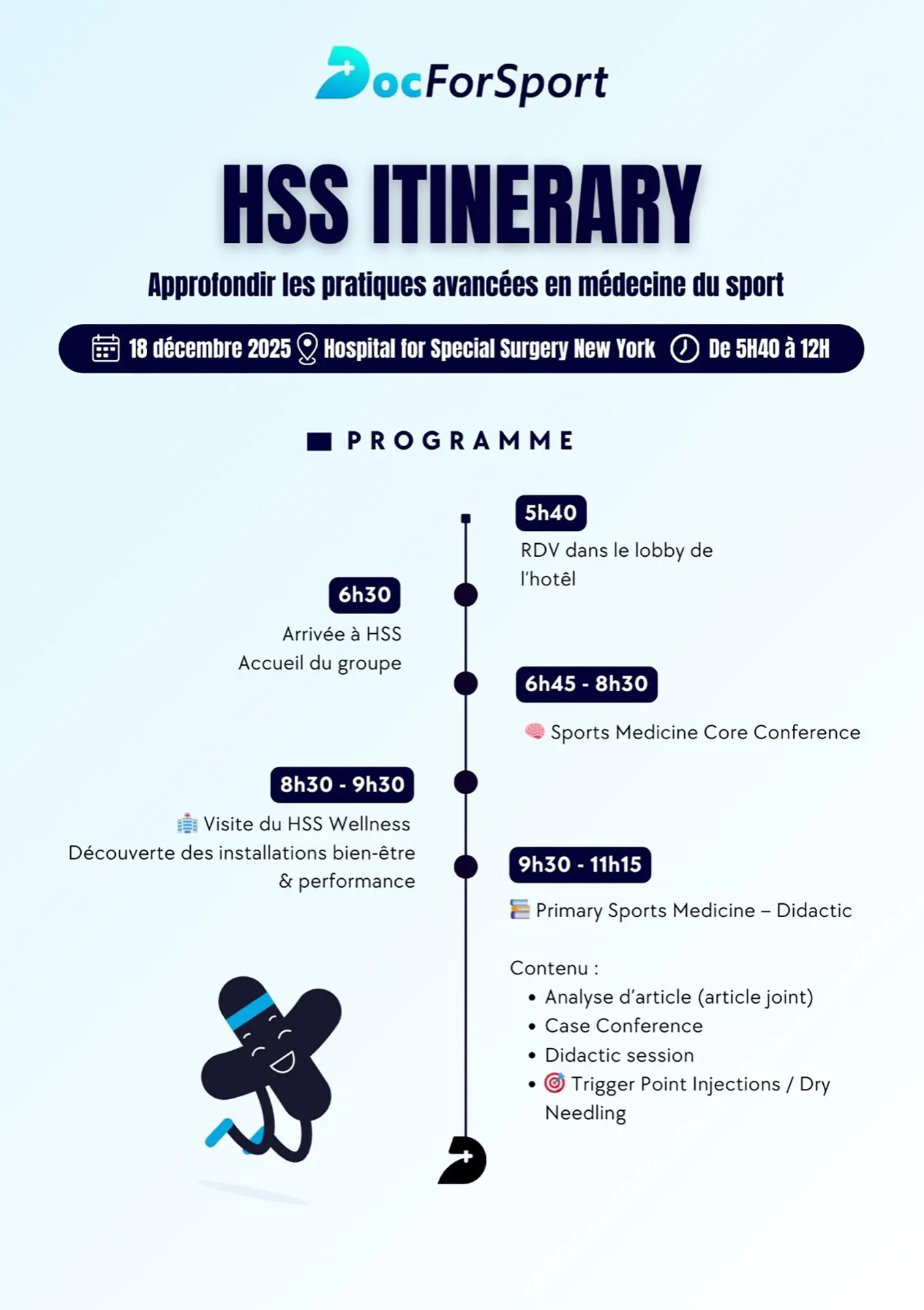 Aujourd’hui nous sommes attendus à 5h40 à l’HSS pour une matinée de conférence avec les médecins.