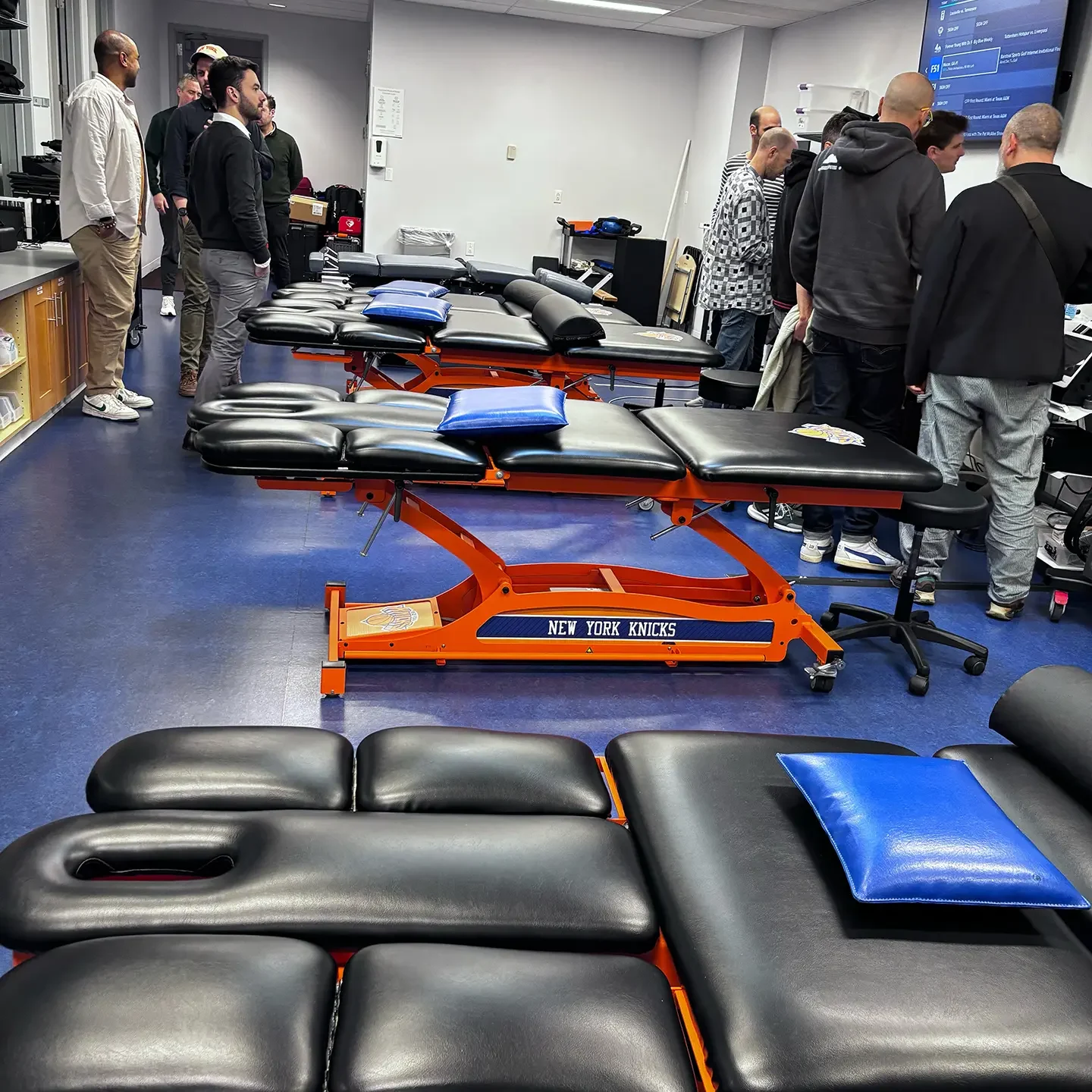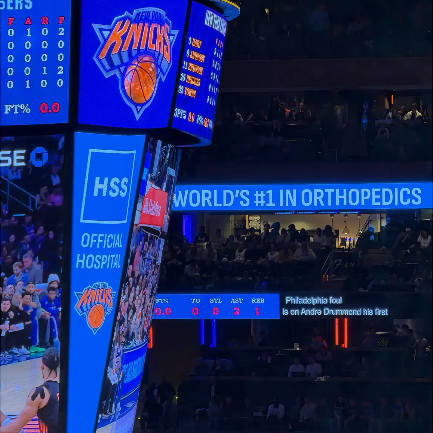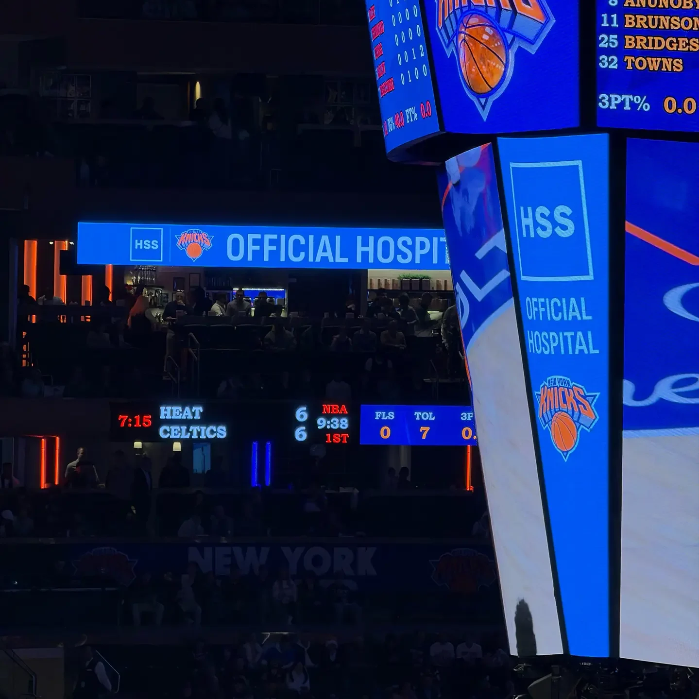Dans le MADISON SQUARE GARDEN, le nom et le logo de l’HSS sont omniprésents. On ressent une fierté d’afficher le partenariat, voire le sponsoring entre l’hôpital et la franchise privée professionnelle.