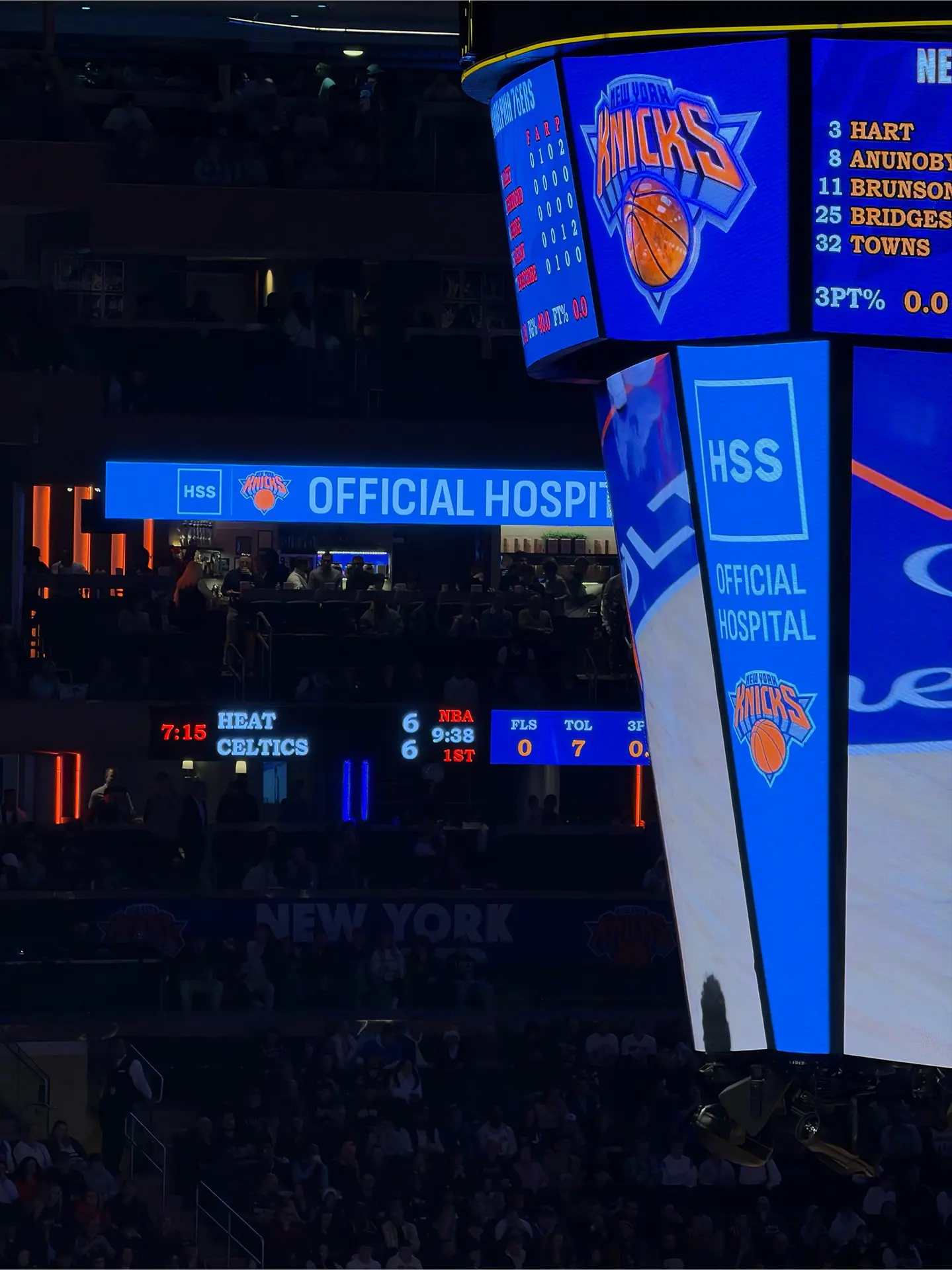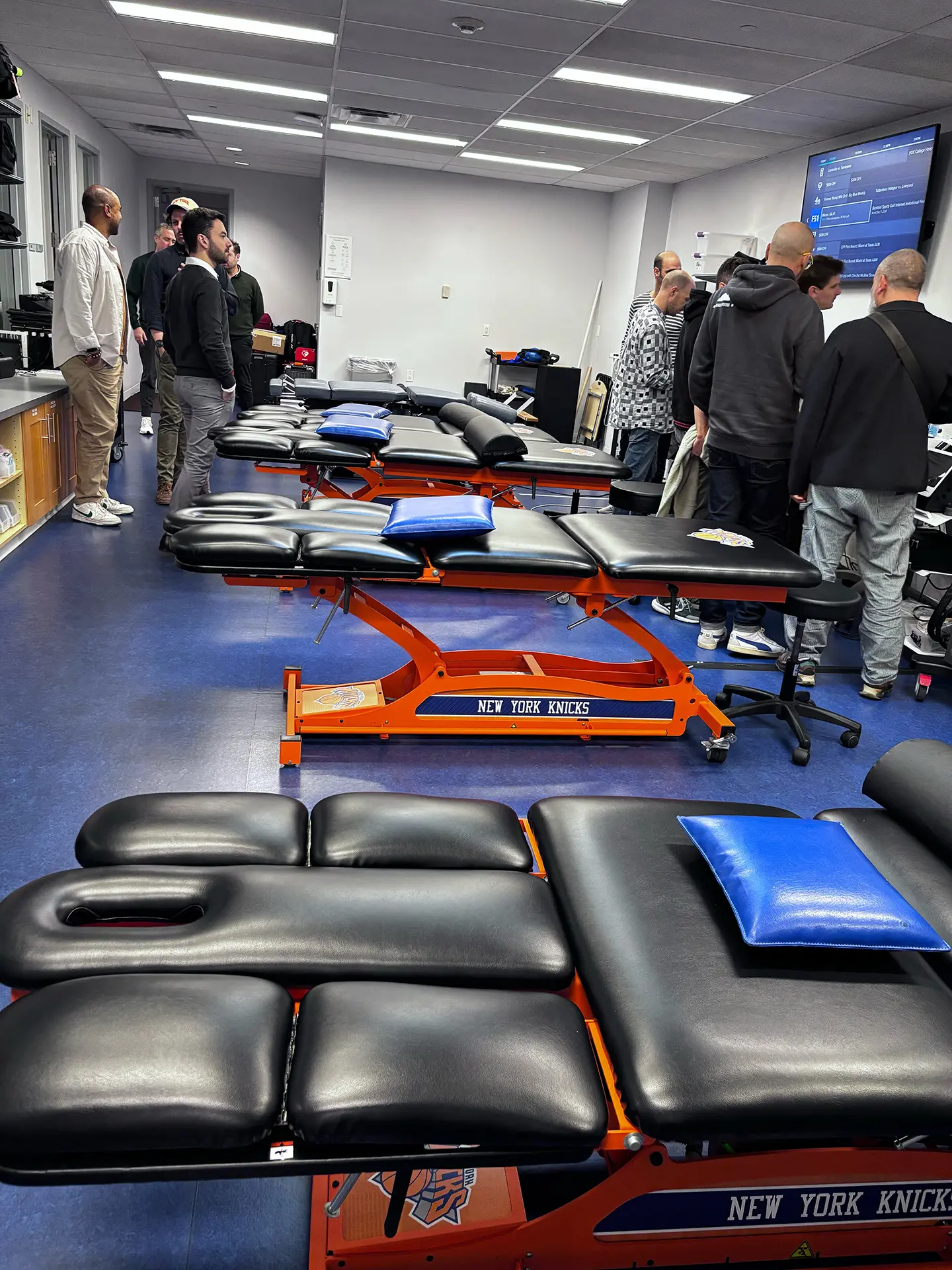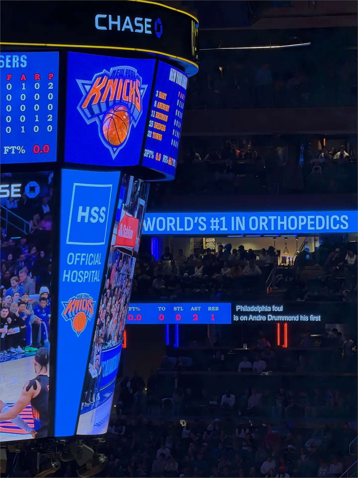 Dans le MADISON SQUARE GARDEN, le nom et le logo de l’HSS sont omniprésents. On ressent une fierté d’afficher le partenariat, voire le sponsoring entre l’hôpital et la franchise privée professionnelle.
