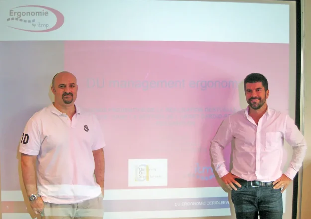 Stéphane Evelinger et Arnaud Cerioli ont suivi la formation en DU de management ergonomique des postes de travail organisée par l’itmp en partenariat avec l’ISEM de Nice.
